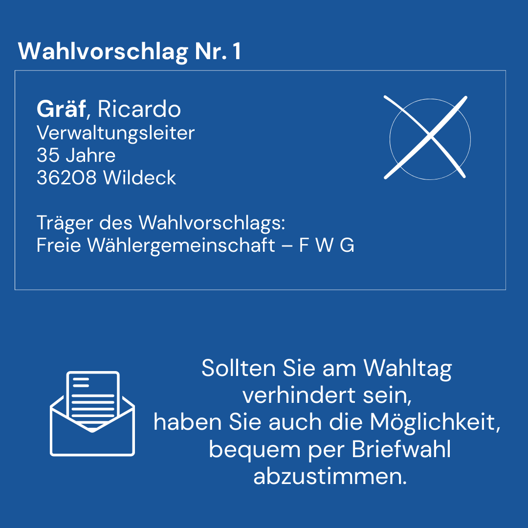 Zur Bürgermeisterwahl trete ich als Kandidat der Freien Wählergemeinschaft Wildeck an. Wenn Sie wissen möchten, wofür wir uns als FWG Wildeck einsetzen, können Sie sich auf unserer Webseite informieren oder mich bzw. uns gern direkt kontaktieren. Wir freuen uns auf das Gespräch!
